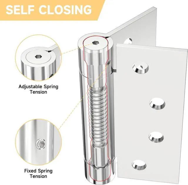 SELF-CLOSINGAutomatic closing door feature, Adjustable Spring Hinge. The accompanying hex wrench let you freely set the tension to Control the Closing Strengths. The thickness 3mm is adopted, with strong bearing capacity, no deformation, corrosion resistance, oxidation resistance. Adjustable tension makes you freely set to leave the door closed or ajar.