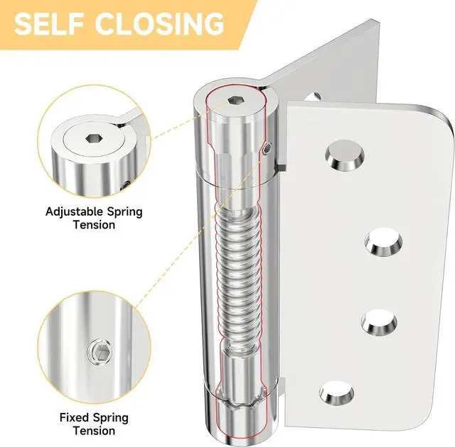 SELF-CLOSINGAutomatic closing door feature, Adjustable Spring Hinge. The accompanying hex wrench let you freely set the tension to Control the Closing Strengths. The thickness 3mm is adopted, with strong bearing capacity, no deformation, corrosion resistance, oxidation resistance. Adjustable tension makes you freely set to leave the door closed or ajar.