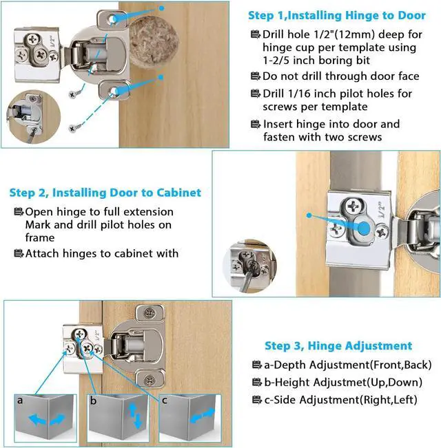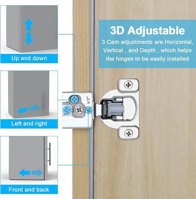 Functional UpgradeOne of the main advantages of the full coverage hidden hinge is that it is fully adjustable since they have three small screws. The door position can be adjusted simply by turning the screws on the hinges of the soft-close cabinet, using these three screws for depth, side and height adjustments. They can be fine-tuned to ensure the door frame is completely hidden and fits perfectly