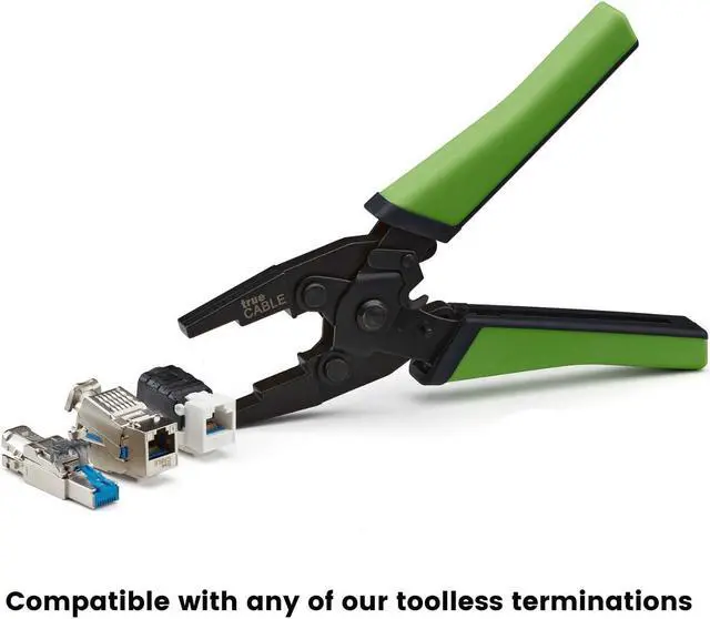 UNIQUE. Specifically designed for trueCABLE toolless keystone jacks and field term plugs. Our dual-level parallel crimping pliers handle most common 90-degree closure mechanisms and field termination plugs on the market. Ultra stable platform allows for perfect terminations every time, ensuring consistency from jack to jack. Works with our unshielded toolless keystones as well.