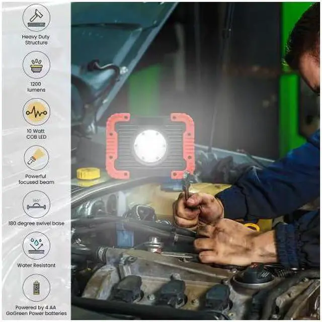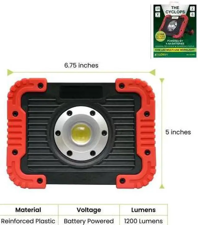 The GoGreen Power Cyclops work light uses brightest white LED technology and provides you with an excellent light source without ever having to charge the battery. The Cyclops is powered by 4 AA batteries and comes with a total of 16. It's heavy-duty structure and carrying handle, allow this item to withstand the roughest times. Looking to hang the Cyclops. Not a problem. Simply swivel the carry handle 180° so it can be placed on a hook. GoGreen offers a fully-paid recycling program at their own expense to further contribute to the GoGreen cause.