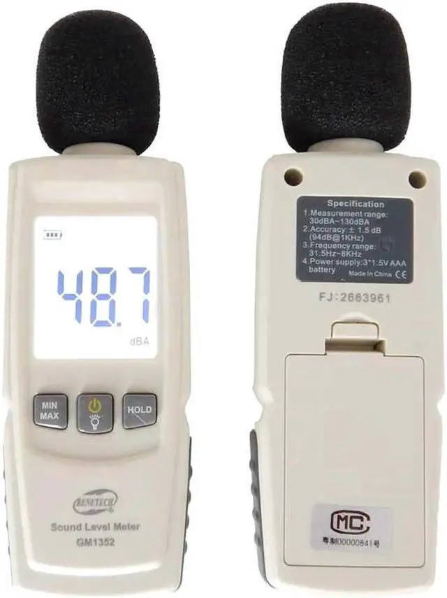 US national standard: ANSI S 1.4 TYPE2 *100% Brand New *With modern, compact, portable design. *Easy to use *Frequency weighting characteristic: A *Equipped with sponge ball to filter-out unwanted signals. *Max reading hold *Auto power off *Auto backlight display *Low battery indication *Powered by 9V Battery (not included) *Approved by CE/ROHS/FCC standard *Under 1 year guarantee
