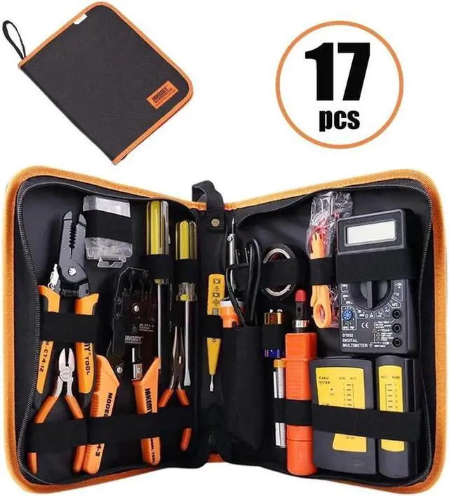 • - 17-in-1 All-in-One Kit - Integrates all essential tools for Ethernet maintenance: RJ45/RJ11 crimping pliers, stripping pliers, LAN Cat5e/Cat6 tester, and soldering iron, meeting daily network needs.