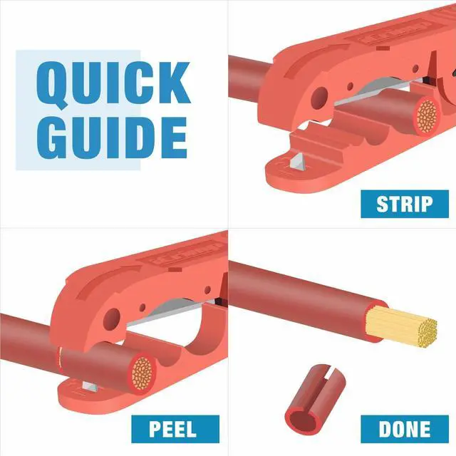 There're various types of cables in the market. ICP-240 is a universal wire stripping tool that tackles PVC, rubber, PE cable jackets of solid cables and stranded cables like battery cables and welding cables. Its durable, high-carbon steel cutting blades that automatically adjust to the cable diameters and won't damage internal conductors. Not recommended for coaxial cables.