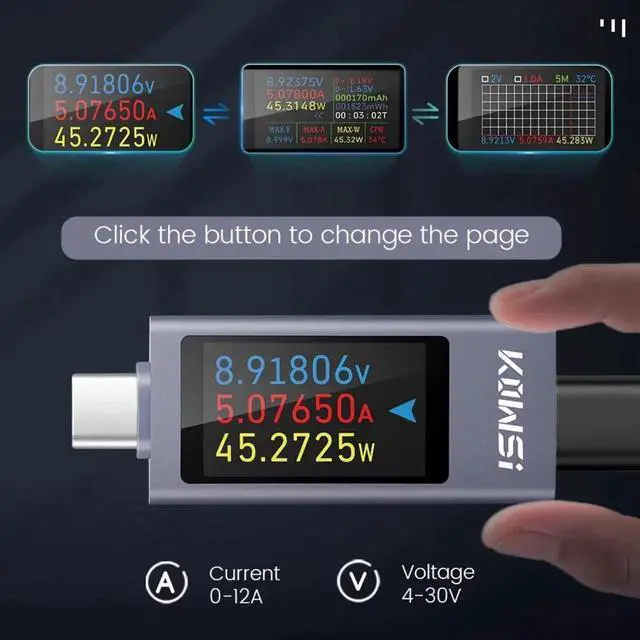 Live Data:Voltage,current,power,capacity,electrical energy,timing,CPU temperature and many other parameters real-time monitoring,Click the button,change the page