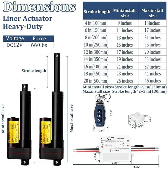- Heavy Duty Performance: This 660 lbs 12V electric linear actuator offers higher thrust than low-force models,matches the cheap linear actuators but comes with remote control kits included. With a 4" (100mm) stroke,0.19/s speed, it delivers strong push force with reliable performance. The integrated base ensures stability, and the built-in limit switch provides accurate positioning