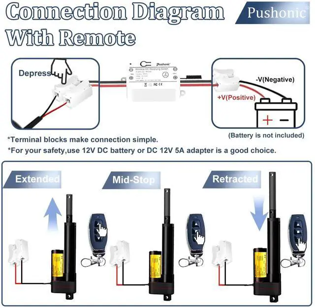 - Motion Controller kit: The actuator kit includes two metal mounting brackets and a DC reversing switch with 2 remote controls,port clips for easy setup.The linear actuator stays securely in place during movement, making it suitable for replacing a double-acting linear actuator or for you automation projects
