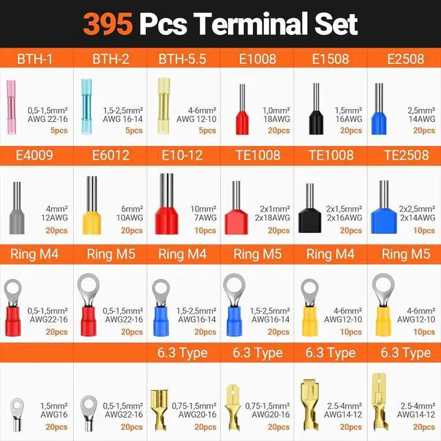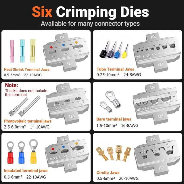 6-Piece Wire Crimping Tool Set- Everything you need for professional-grade connections! This complete kit includes 1 crimping tool and 6 interchangeable dies (for various wire sizes), plus 395 pcs terminals (