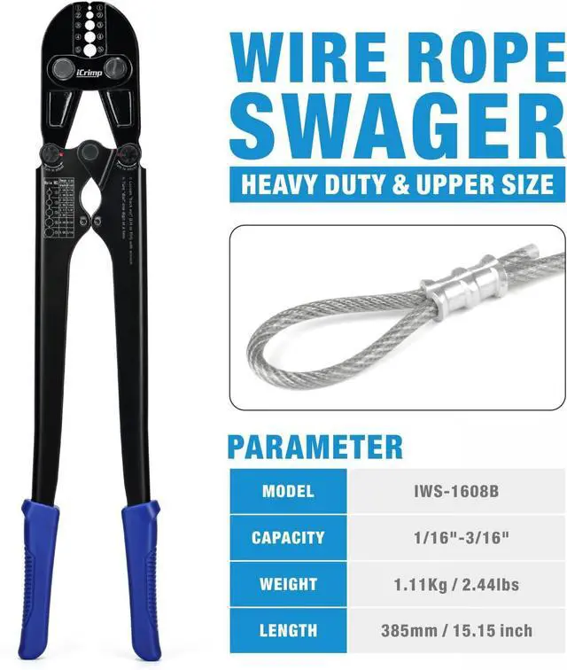 Wire Rope Swager: IWS-1608B wire rope crimping tool has 5 cavities for 1/16, 5/64, 3/32, 7/64, 1/8, 5/32 & 3/16 wire rope cables. Swaging pressure is adjustable. Promises accurate & gauge free swages.