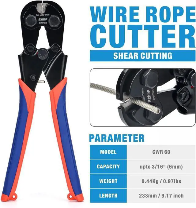 Wire Rope Cable Cutter: CWR-60 wire rope and cable cutter can be used with wire up to 1/8, features non-slip handles for easy grip. The shearing action is precise and leave no frayed ends.