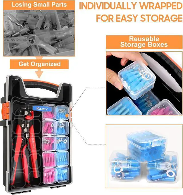 ALL-IN-ONE PORTABLE KITKujects exclusive case organizes the wire stripper, crimping tool, and 340 PCS marine-grade heat shrink connectors. 20 mini compartments keep the electrical connectors separated no more mixing or lost parts. This wiring kit is the ideal choice for both professional technicians and DIY enthusiasts.