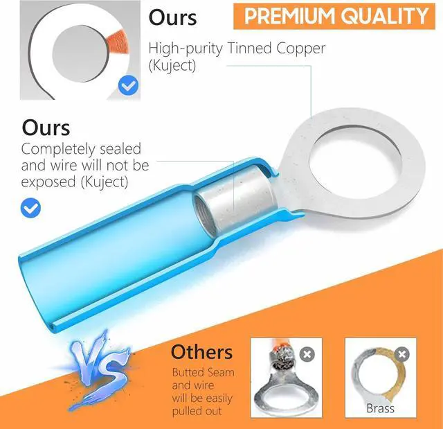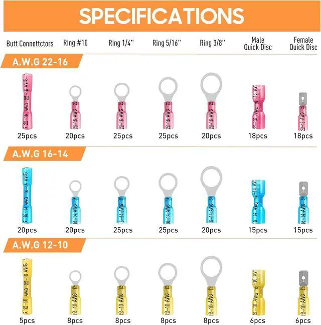 RELIABLE MARINE CONNECTORSGet 340PCS of marine wire connectors in red (AWG 22-16), blue (AWG 16-14), and yellow (AWG 12-10) for versatile applications. This wire connectors kit features connectors made from high-purity tinned copper for superior conductivity. The 3:1 shrink tubing with internal adhesive creates a waterproof, airtight seal when heated-ideal for marine or auto applications.