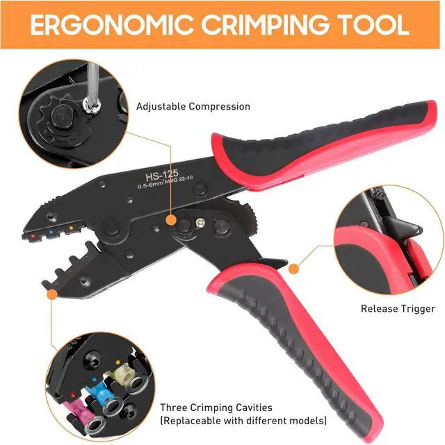 ADJUSTABLE RATCHETING CRIMPERFeatures an adjustable ratcheting mechanism and release function. This crimper tool electrical has non-slip, ergonomic handles providing a comfortable grip and optimal leverage, making wire crimping effortless and ensuring a secure, professional-quality crimp every time for your electrical connectors.