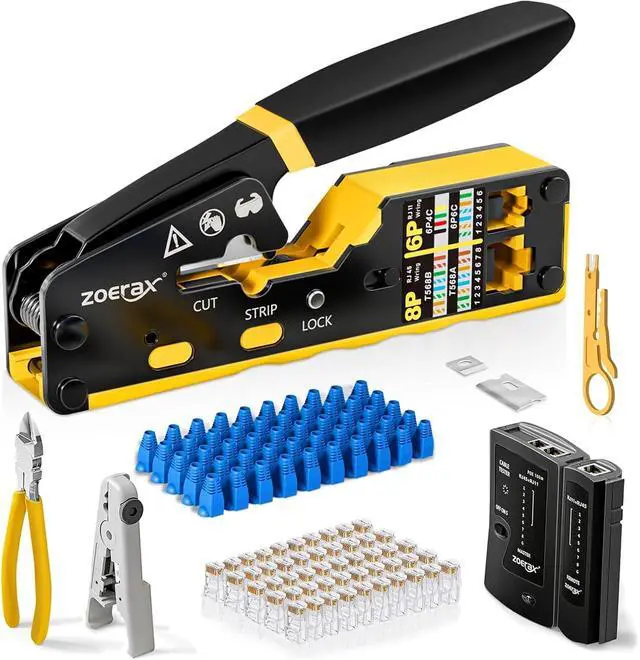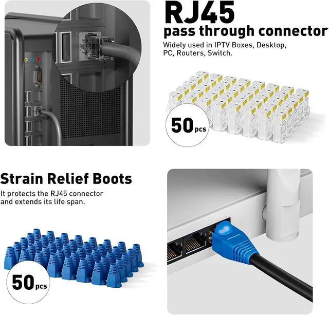 RJ45 Crimp Tool KitThe kits included Pass Through RJ45 Crimper tool with a set of spare blades, RJ45 Network Cable Tester, Wire Cutters Pliers, Network Cable Stripper, Mini Cable Stripper, 50PCS CAT6 Pass Through Connectors and 50PCS strain relief boots.