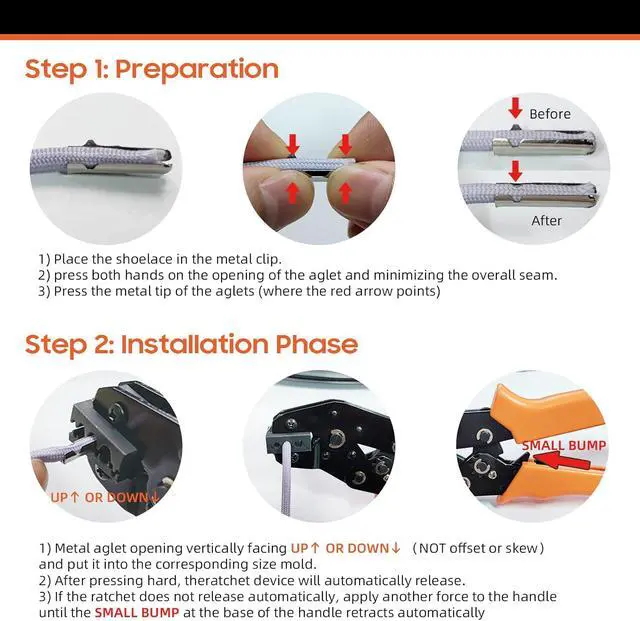 Aglet crimping tool allows you to DIY change your hoodie string end caps, beach pants, and shoelace metal shoelace tips. Simply Press Down and you have a new and perfect shoelace tip head without having to replace the entire rope or laces