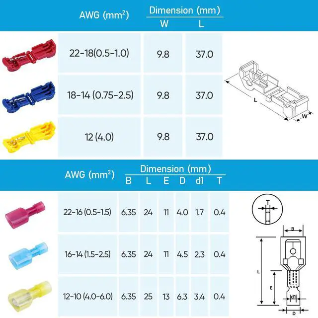 [WIDE APPLICATIONS] The T-Tap Wire Connectors and Male Quick Disconnects will last for numerous wiring projects. Marine, automotive, scientific, home wiring projects - you name it. TICONN T TAP connector kit will allow you to quickly tap into any wire in any application. The connector assortment includes red (AWG 22 16), blue (AWG 16 14) and yellow (AWG 12 10) T-TAP connectors that can be used on wire AWG from 22 to 12