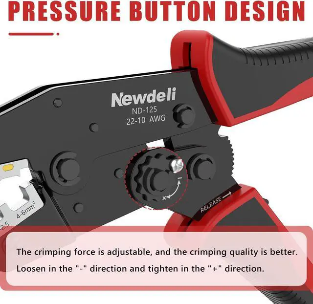 ERGONOMIC & NON-SLIP DESIGNCrafted for optimal comfort, the Newdeli Crimping Pliers feature ergonomically designed, non-slip handles that deliver a secure, confident grip. Easily crimp AWG 22-10 ( 0.5 - 6.0 mm²) connectors, and benefit from a convenient quick-release lever that allows the jaws to open at any angle for enhanced versatility.