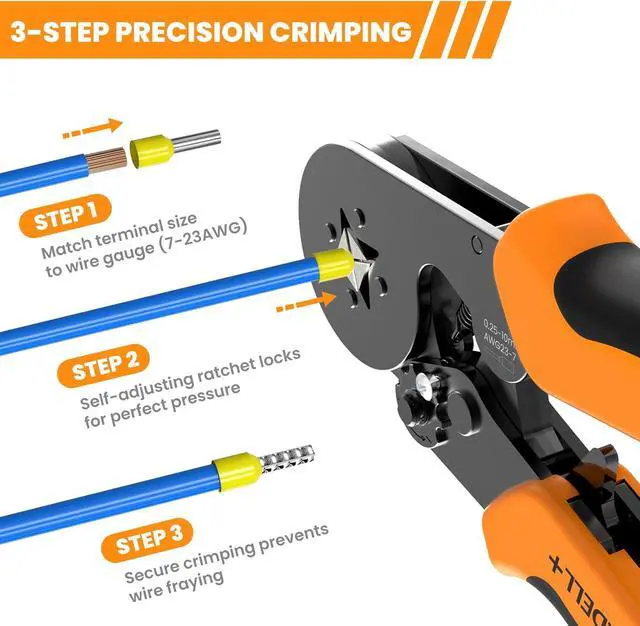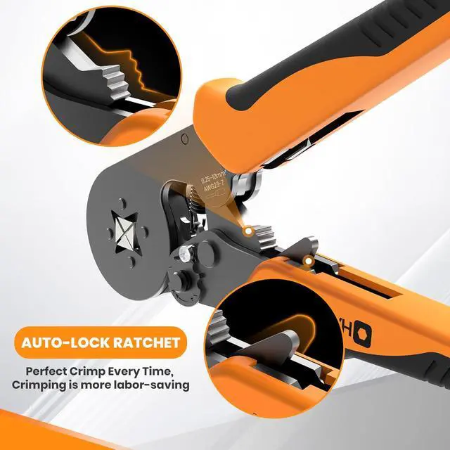 Self-adjusting RatchetThe ferrule crimping tool kit adopts a self-adjusting ratchet structure, automatically adjusting to the stripped terminal' s diameter, ensuring accuracy and reliability, avoiding terminal waste. A newbie can easily handle a perfect DIY