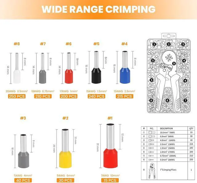 Ready to UseThe ferrule connectors kit comes with 1200 terminals and a ferrule crimper (AWG: 23-7). The crimping area is 0.25 -10 mm². It can help you complete the wiring quickly and prevent the wires from being worn and broken, suitable for various equipment switches and homes