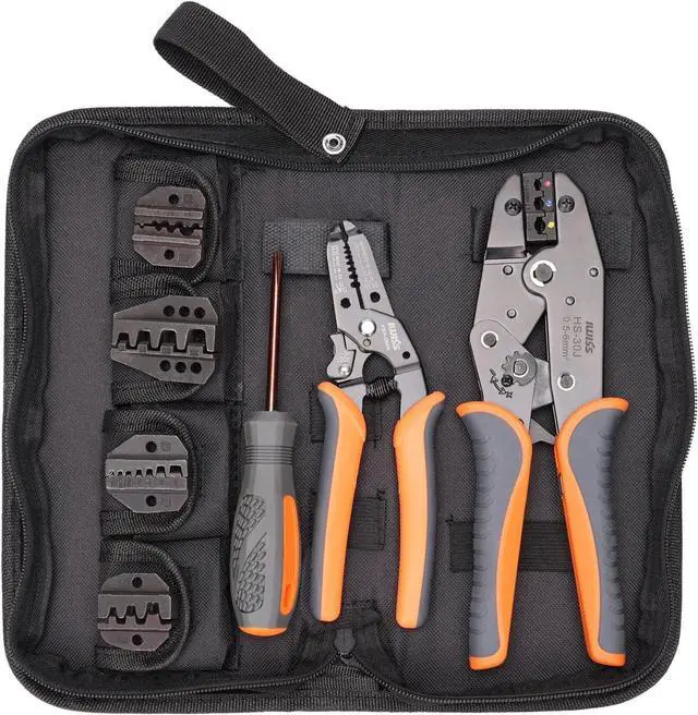 Versatile wire crimper set includes 1 ratchet crimper frame with 5 jaws, wire stripper and cross screwdriver. Satisfy the crimping needs of regular terminals, must have for electricians and DIYers.