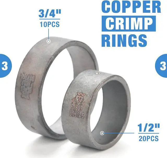 All-in-One PEX Piping Tool Kit: IWS-1234C PEX plumbing kit is designed to make copper crimp ring and copper sleeves connections in sizes 1/2-inch to 3/4-inch. The tool set includes PEX crimping tool (1), PEX cutter (1), 1/2 copper crimp ring (20), 3/4 copper crimp ring (10).