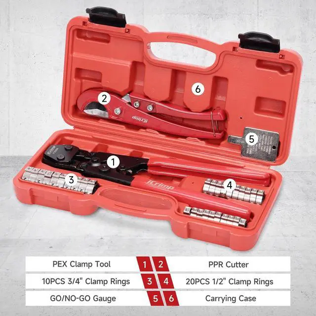 ALL-IN-ONEThis is a All-in-one kit for pex pipe installation, it includes a cinch tool, a Pex cutter, 20pcs of 1/2-inch clamps and 10pcs of 3/4-inch clamps