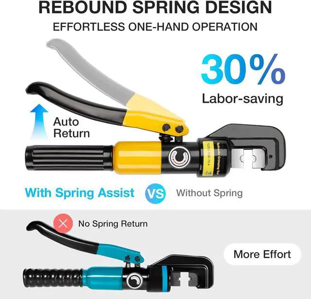 One-Handed Operation: The YQK-70-A battery cable lug crimping tool is engineered with magnetic rails to snap dies firmly in place, effectively eliminating wobble for true single-handed use. It ensures easy operation via a pressure On-Off control and an innovative handle return spring. Upon completing the clamping process, simply turn the button, and the crimping tool will auto-release instantly.