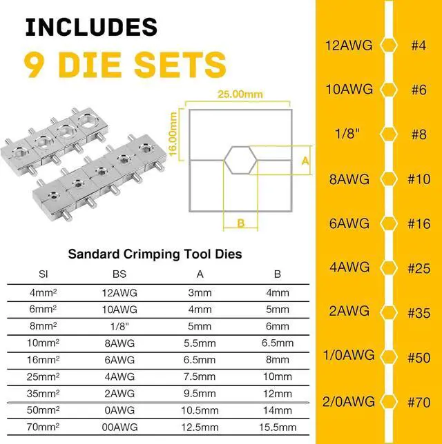 Extra Dies: The hydraulic crimper tool kit includes 9 pairs of hexagonal crimping dies for 12, 10, 8, 6, 4, 2, 1/0, and 2/0 AWG, suitable for crimping battery cables and electrical lugs, as well as a 1/8" die for crimping steel cable railing.