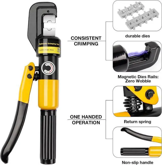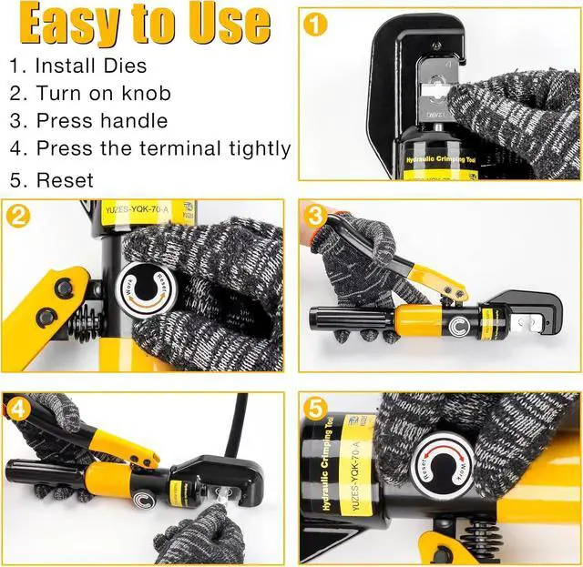 Excellent Quality: The YUZES hydraulic wire crimper tool is made of durable materials with high strength and good toughness. Combined with overall quenching technology, the pliers head is strong and will not break. The dies are made of hardened steel with a chrome finish and crimp stainless steel fitting terminals more tightly.
