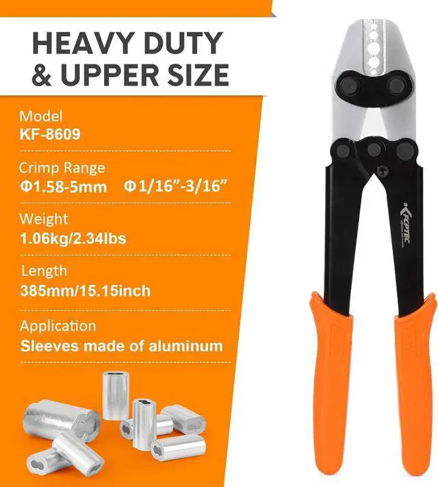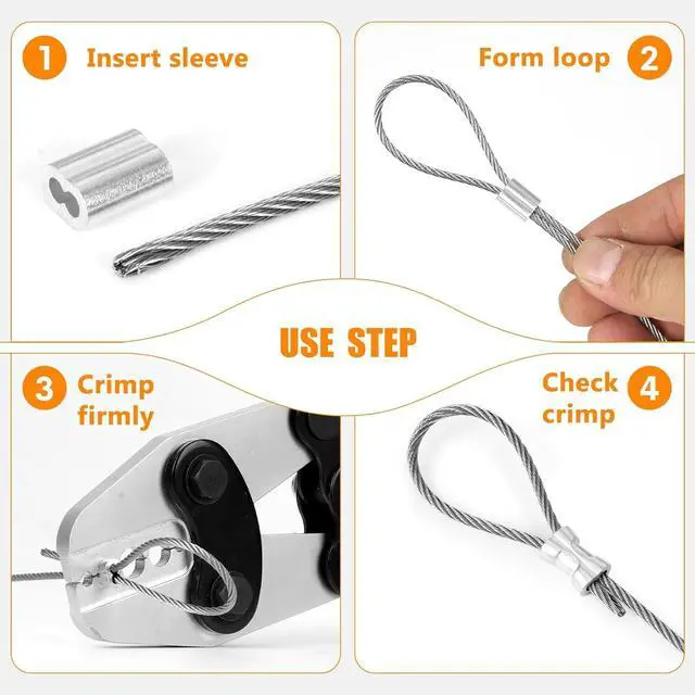 Dedicated Crimping ToolDesigned for secure compression of thick-walled sleeves, ensuring clean and firm swages. No cutter included to avoid sleeve damage. For best results, strip wire coating before use.