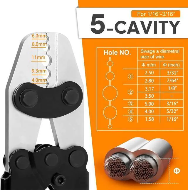 sizes: 1/16" ( 1.58 mm), 3/32" -7/64" ( 2.5 - 2.8 mm), 1/8" ( 3.17 - 3.5 mm), 5/32" ( 4.0 mm), and 3/16" ( 5.0 mm). Supports oval and double barrel sleeves, ideal for fencing, rigging, marine, or cable railing.