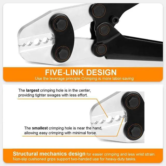 Structural Mechanics DesignCrimp holes arranged by mechanics: the largest in the center delivers tighter swages with less effort; the smallest near the wrist allows easy crimping with minimal force. Cushioned grips support two-handed use, reducing fatigue during heavy-duty or extended tasks.