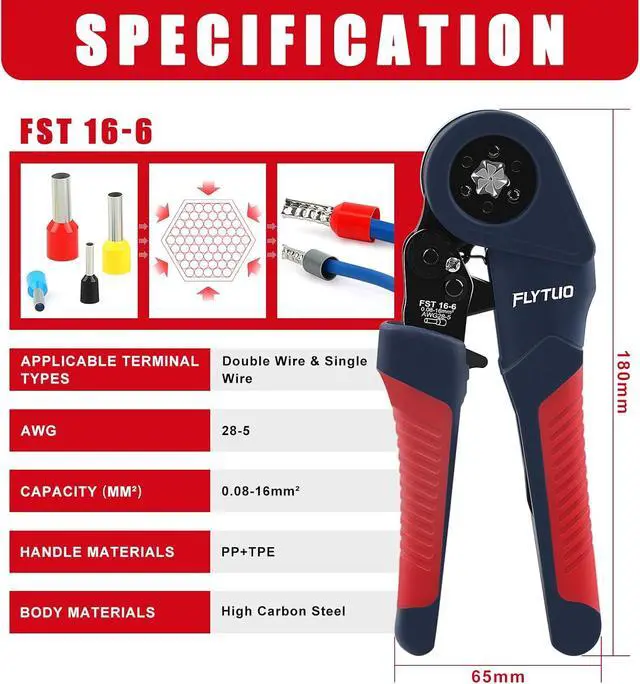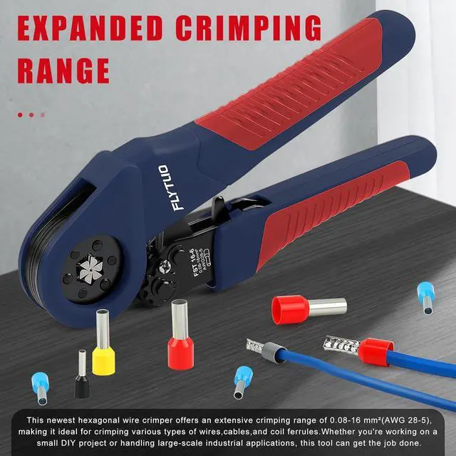 Expanded Crimping Range- This newest designed hexagonal wire crimper offers an extensive crimping range of 0.08 -16 mm²(AWG 28-5), making it ideal for crimping various types of wires, cables, and coil ferrules. Whether you' re working on a small DIY project or handling large-scale industrial applications, this tool can get the job done.