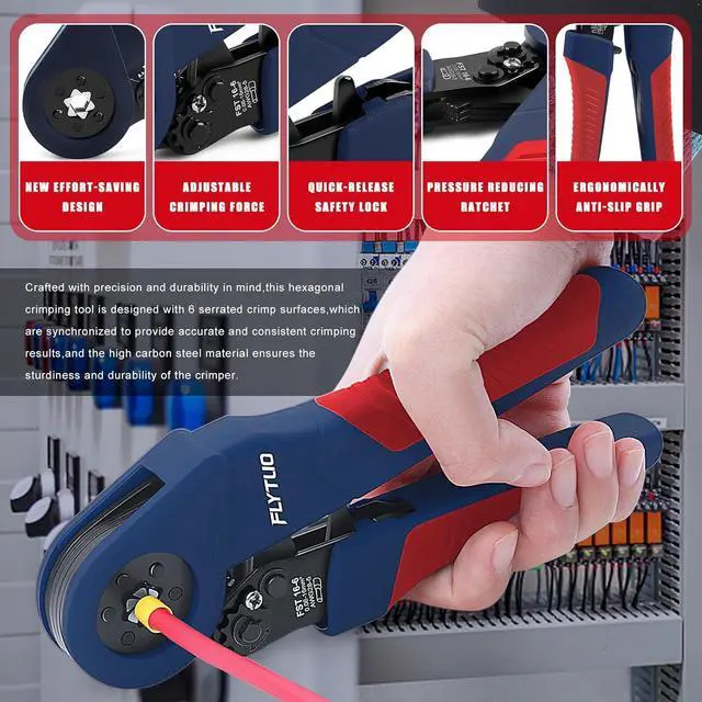 Improved-Design and User-Friendly- This new design of hexagonal wire crimper can help users save more effort while working compared to the old model. The ergonomic frosted grip provides appropriate friction, allowing you to work more efficiently and comfortably, it will be satisfying when you use the accurate ratchet mechanism to crimp terminals.
