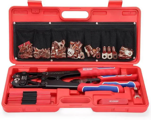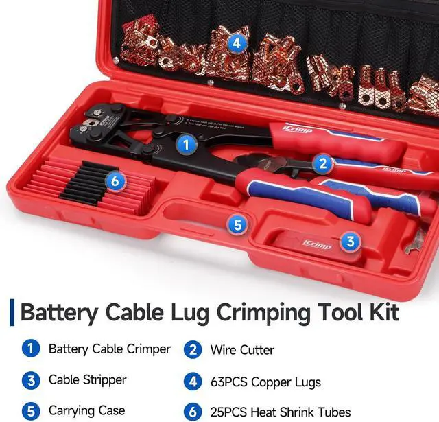 Battery Crimping Tool KitInclude a Battery Cable Crimper, Wire Cutter, Wire Stripping Knife, Carrying Case, 63pcs ring terminal connectors(Includes 10 each of 2 AWG 3/8, 4 Awg-3/8, 6 Awg-3/8. 5 each of 1/0 AWG-3/8, 1/0 AWG-3/16, 2 AWG-5/16, 4 Awg-5/16, 6 Awg-5/16, 8 AWG-5/16. 3pcs 1/0 AWG-5/16 ) and 25pcs heat shrink tubing(15pcs 3:1 red, 10pcs 1/2, 3:1 black, 3/8).
