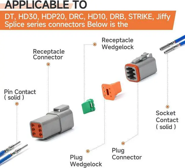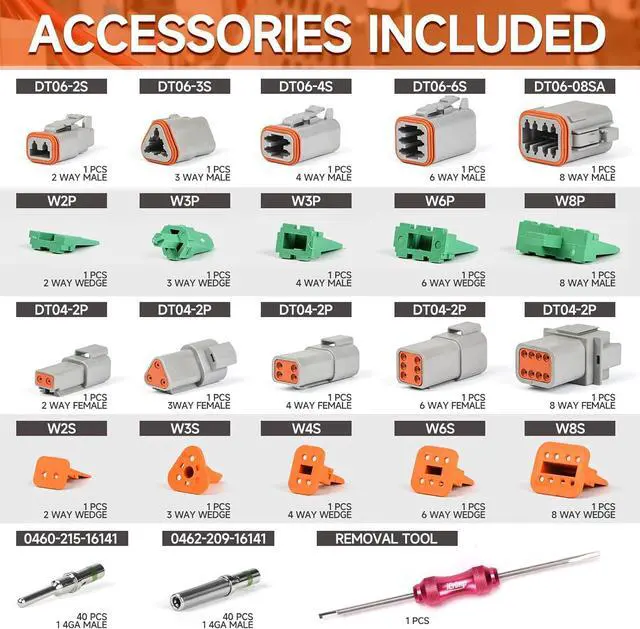 Kit ContentsKit includes a Deutsch crimper, 2, 3, 4, 6, 8, 12 pin connectors, 14ga male and female terminals 40pcs each and a removal tool. The connectors are waterproof, dustproof, and suitable for 20-14 ga wire