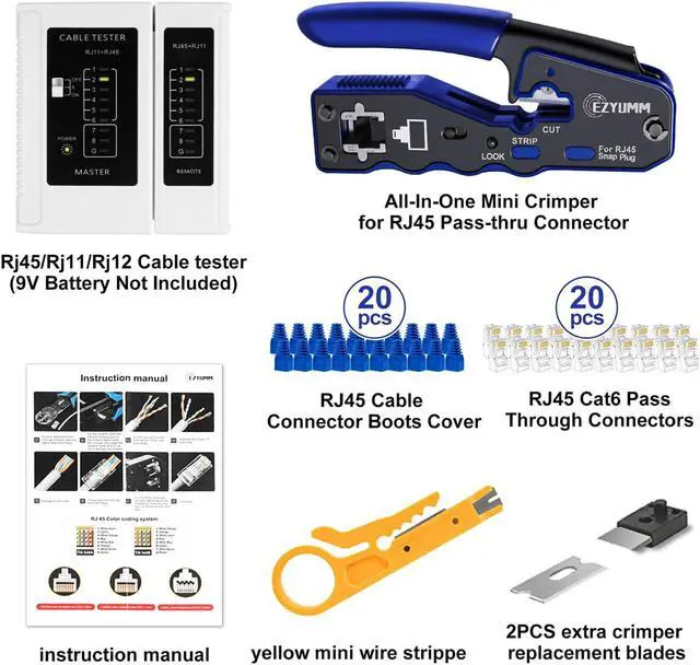 RJ45 Crimp Tool Kit: 1PCS rj45 crimp tool, 20PCS rj45 pass through connector, 20PCS RJ45 Cable Connector Boots Cover, 1PCS Rj45/Rj11/Rj12 ethernet tester (9V Battery Not Included), 1PCS yellow mini wire stripper, 1PCS instruction manual, 2PCS extra crimper replacement blades.