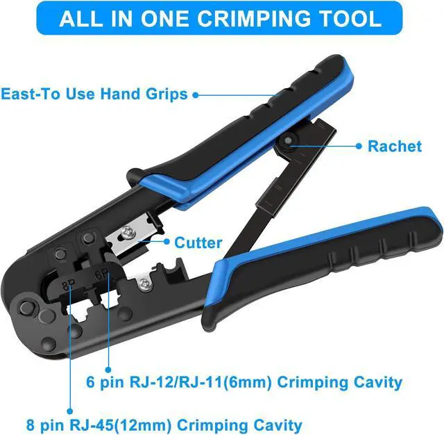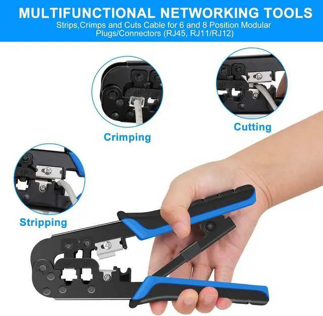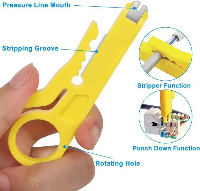What You Get: 1 RJ45 Crimp Tool with 20PCS RJ45 Cat5 Connectors, 20PCS Covers, 1 Ethernet Cable Tester and 1 Network Wire Stripper