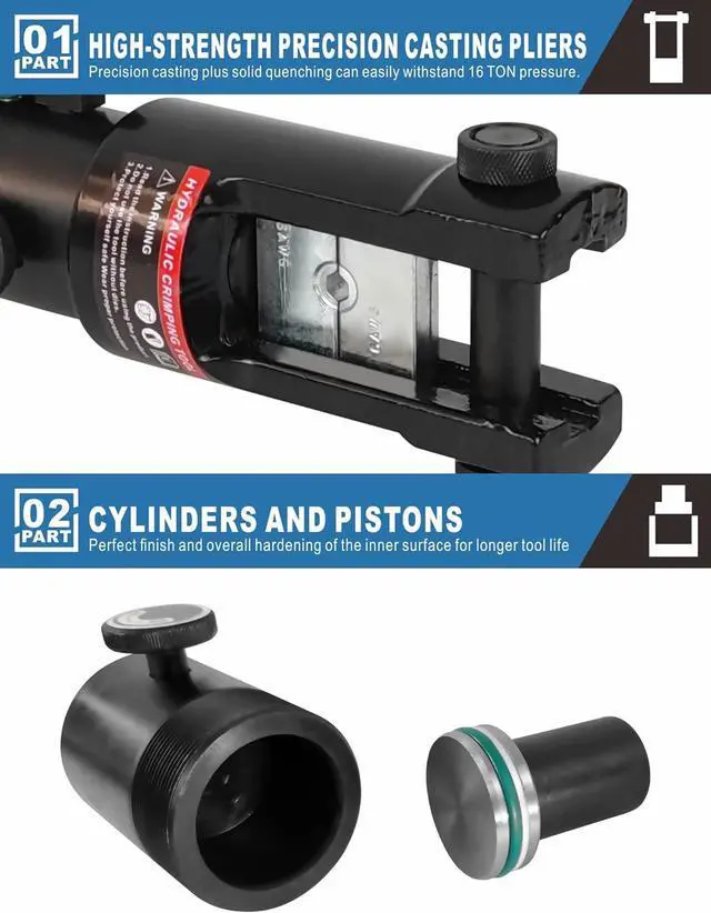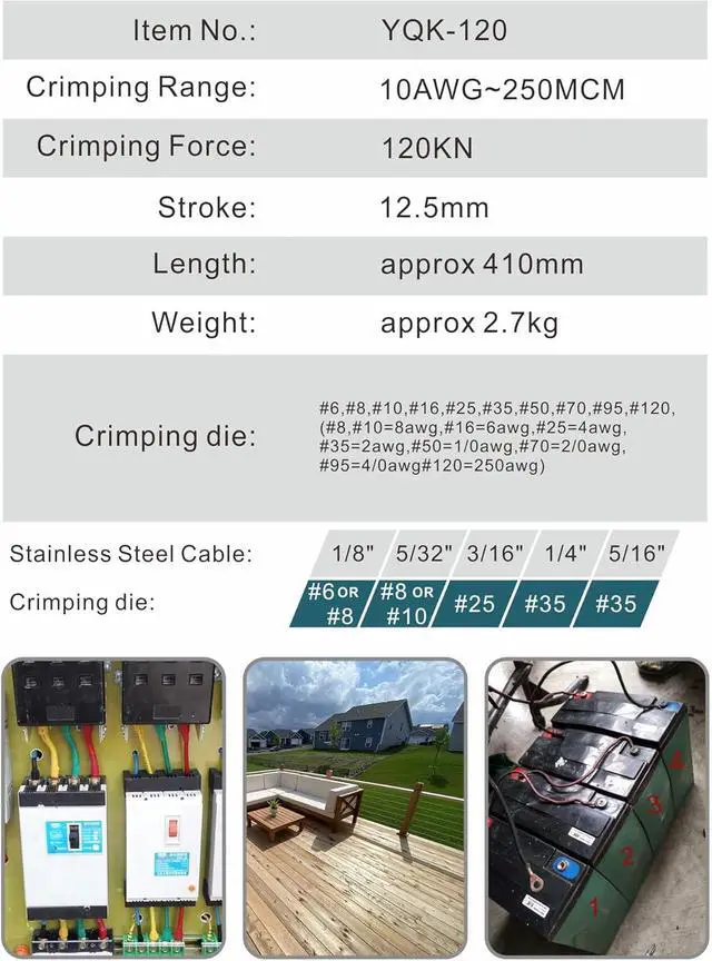 Hydraulic crimping tool specification: Crimping range 8 AWG-4/0AWG, Stroke 0.6I nch, Max