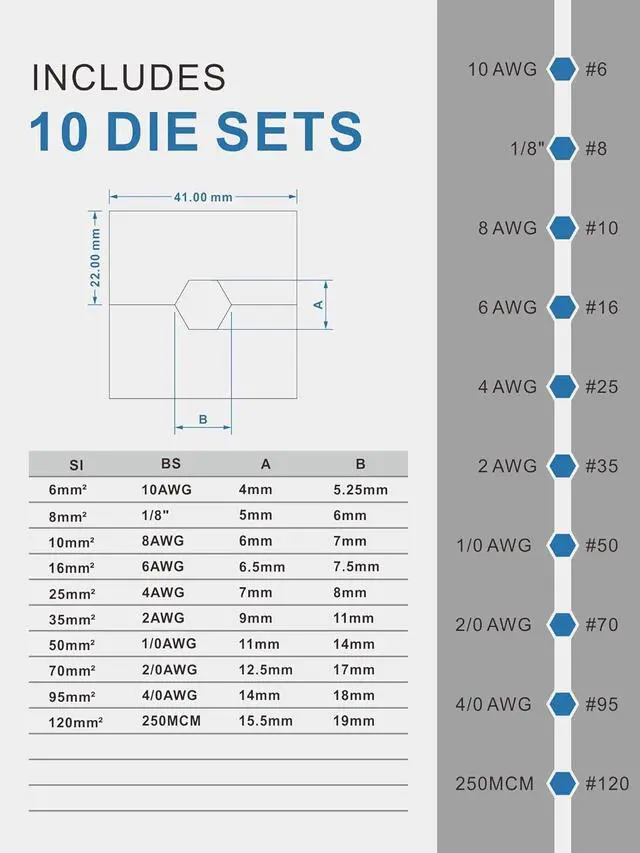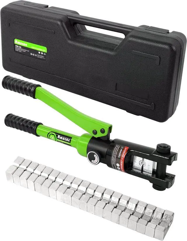 Hydraulic crimping tool 9 pairs of dies: 8 AWG, 6 AWG, 4 AWG, 2 AWG, 1 AWG, 1/0 AWG, 2/0 AWG, 3/0 AWG, 4/0 AWG.