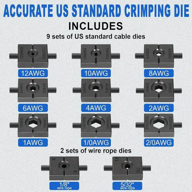 [11 Pairs of Crimping Dies] With 9 sets of US standard cable dies (12 AWG, 10 AWG, 8 AWG, 6 AWG, 4 AWG, 2 AWG, 1 AWG, 0 AWG, 00 AWG) and 2 sets of wire rope dies(1/8", 5/32" )