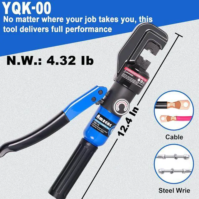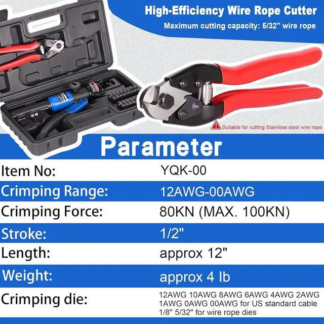 Crimping Tool] Crimping Range: 12 AWG~00 AWG, Standard Crimping force is 80 KN (MAX. 100 KN), Stroke: 1/2", Max Cutting: 5/32"
