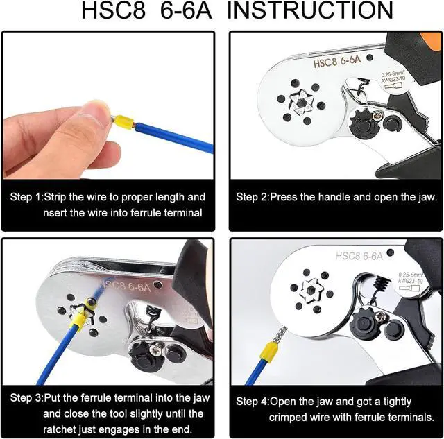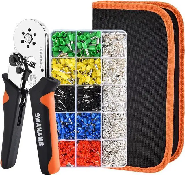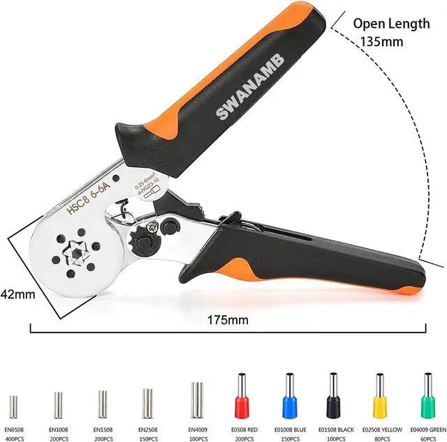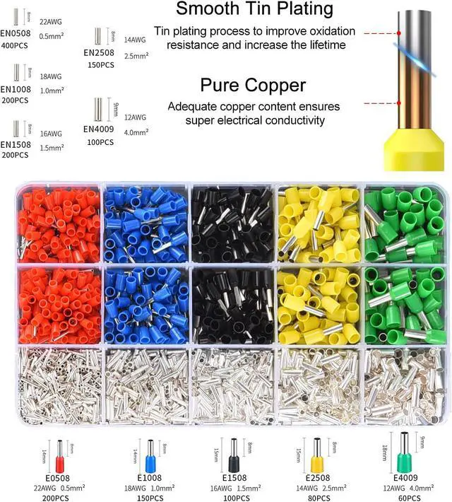 Ferrule Crimping Range AWG23-10( 0.25 - 6.0 mm²). Each kit comes with a handy ferrule crimping plier (Hexagonal ) with 1640pcs wire ferrules terminals to support small DIY projects and large electrical repairs.