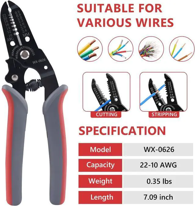 Multi-functional Wire Stripper This tool efficiently removes insulation from wires ranging from 10-22 AWG, with additional cutting capabilities for copper and iron wires.