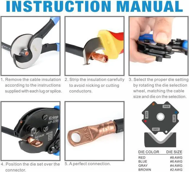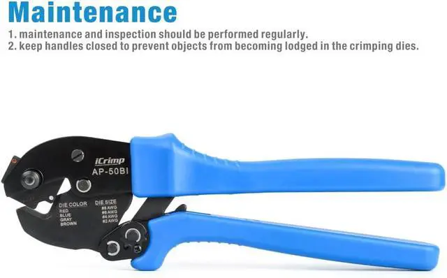 Purpose: AP-50BI battery cable terminal crimping tool is designed to crimp 8, 6, 4, 2AWG copper / tinned eyelets in special trapezoid profile.