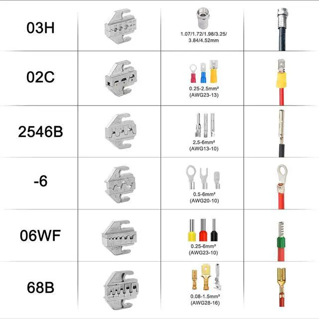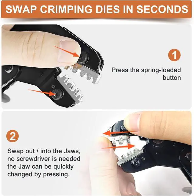 Full range of jaws: A full range of jaws are available to meet the needs of a wide variety of wire connector and terminal crimping tasks. 6 types of wire crimper dies are available, including crimping insulated nylon terminals, non-insulated terminals, ferrule wire terminals, open barrel terminals, coaxial terminals, and solar connectors. Easy to chang and easily complete your wiring tasks.