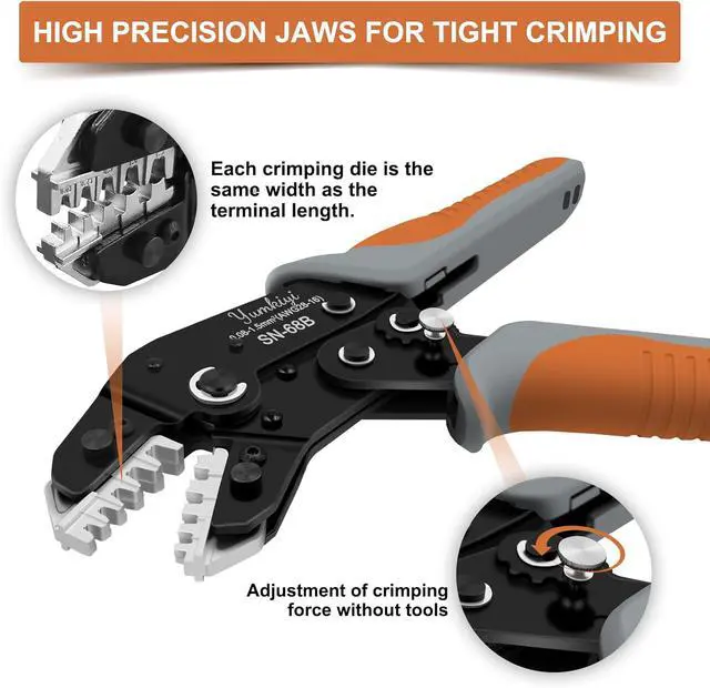 Labor-saving design: Ratchet mechanism makes the wire crimp tool operate smoothly and labor-saving. Ergonomic handle design can reduce hand fatigue when using for a long time. The crimpers force can be adjusted by the star wheel to achieve the best crimping effect in different situations.