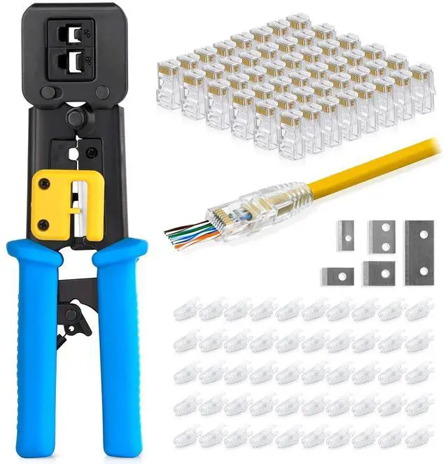 RJ45 Crimp Tool Kit Includes - 50 pcs Cat6 pass through connectors, 50 Clear Cable Strain Relief Boots & Extra replacement blades