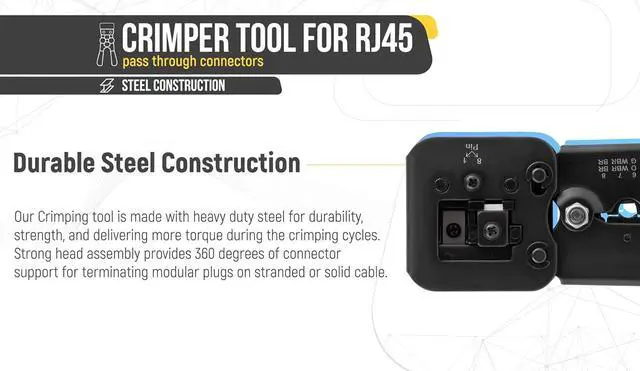Built to Last The steel construction is durable and lasts you many years of cutting, stripping and crimping internet cables. The action feels firm and is suited for heavy duty performance.