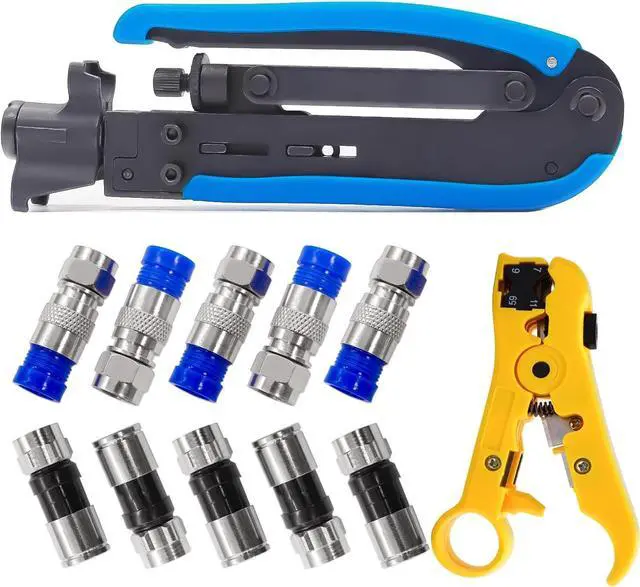Product packaging: 1PCS Coax Cable Crimper, 1PCS Stripping Tool, 5PCS Blue Connectors, 5PCS Black Connectors.